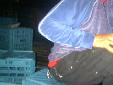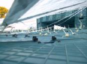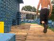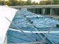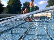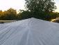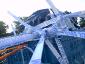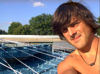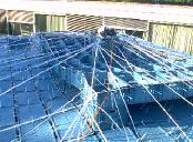 die diagonal laufenden kunstoff-seile wurden mit dem höchsten punkt/dach/untergrund verspannt. alle auftretenden kräfte waren jetzt optimal verteilt. das dach konnte nun umfangreich von uns vernetzt/verspannt werden um den großen folien einen stabilen untergrund zu liefern. dies war nötig um kommenden wassermassen keine chance zu geben. |