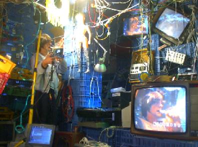 log_buch_eintrag_ <_log_start> die innen_base der base_innenraum wurde zum einen als wohnstelle, zum anderen als fernsehstudio für die taeglich-digital-sendung und generell als arbeitsplatz genutzt. die base war also mit zwei schlaf-kojen_für_die_crew/arbeits-stationen/material/technik/lager/-plätzen/mister_digital und einer komplexen fernsehstudioinstallation ausgestattet. die schlafkojen befanden sich rechts und links des eingangs erhöht über den köpfen der besucher. gegenüber der eingangstür war das zentrum der fernsehstudio-installation. dort gab es eine bühne, die nach hinten in eine fernsehstudio-wand aus aufgetürmten fernsehern/ monitoren/geräten überging. auf den monitoren bekam man zweierlei bilderfluten zu sehen: unsere live fernsehsendung/flows. das licht der bildschirme/fernseher und das der unzähligen farbigen lichter/strahler bestimmten die lichtverhältnisse. tageslicht konnte lediglich durch die eingangstür und durch die schlitze in den kisten in die base hineinstrahlen. |